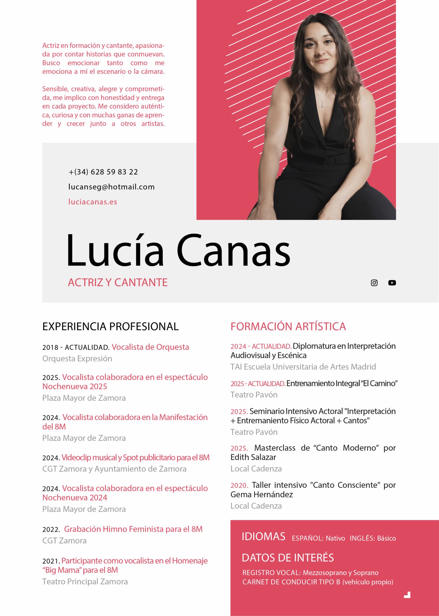 Soy Lucía Canas Segurado, zamorana de 29 años y amante del arte desde niña. Diseñadora gráfica, cantante y actriz en formación, busco emocionar tanto como me emociona a mí el escenario o la cámara. Sensible, creativa, alegre y comprometida, me implico al máximo con honestidad y pasión. Amo el deporte, la naturaleza y aprender de los demás.